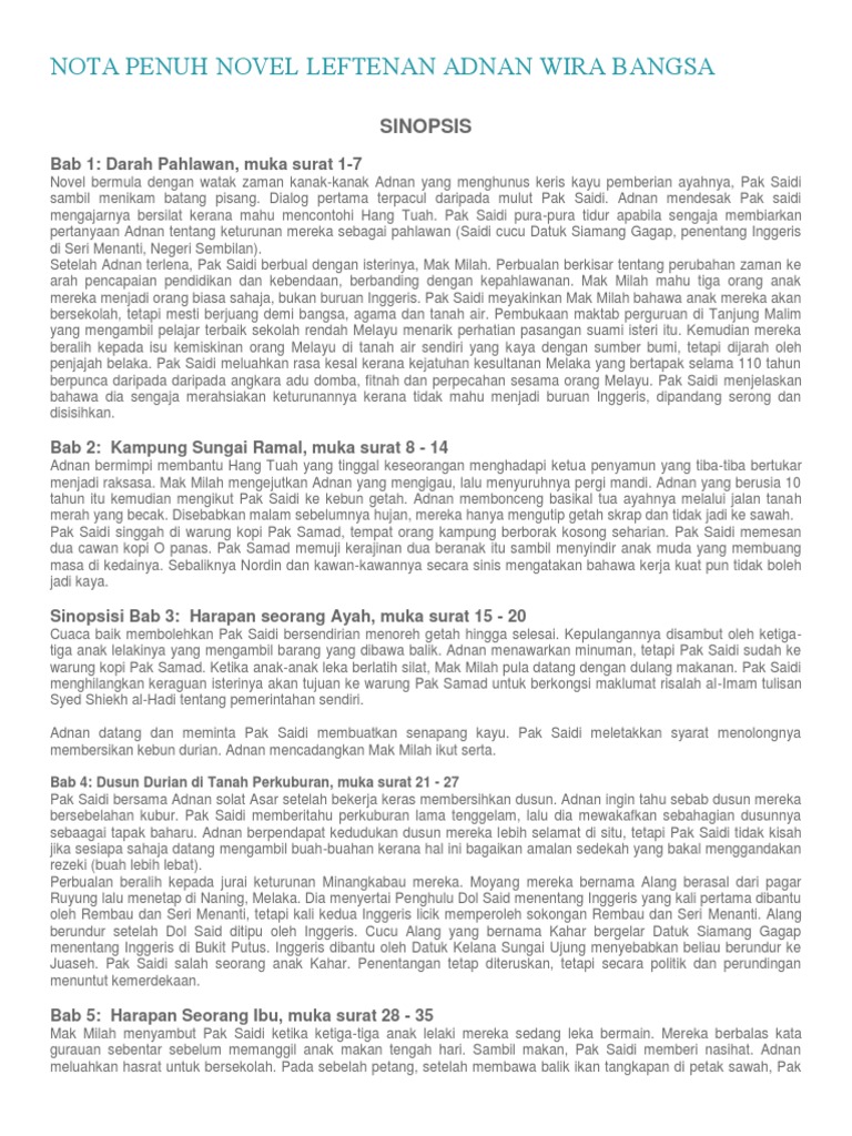 Novel tingkatan 4 ( leftenan adnan wira bangsa). Novel leftenan adnan wira bangsa, karya penulis novel sejarah prolifik abdul latip talib, memaparkan kisah serangan terakhir askar jepun di singapura serta keberanian dan keperwiraan askar melayu yang sanggup berjuang sehingga ke hujung nyawa. Novel leftenan adnan wira bangsa (k4). Pak saidi berasa amat gembira kerana dikurniakan tiga orang anak lelaki. Dalam pertempuran dengan askar jepun, askar melayu menunjukkan keberanian dan semangat keperwiraan yang hebat di mana seramai 152 anggota askar melayu, termasuk 7 pegawai melayu dan 6 orang pegawai british yang.